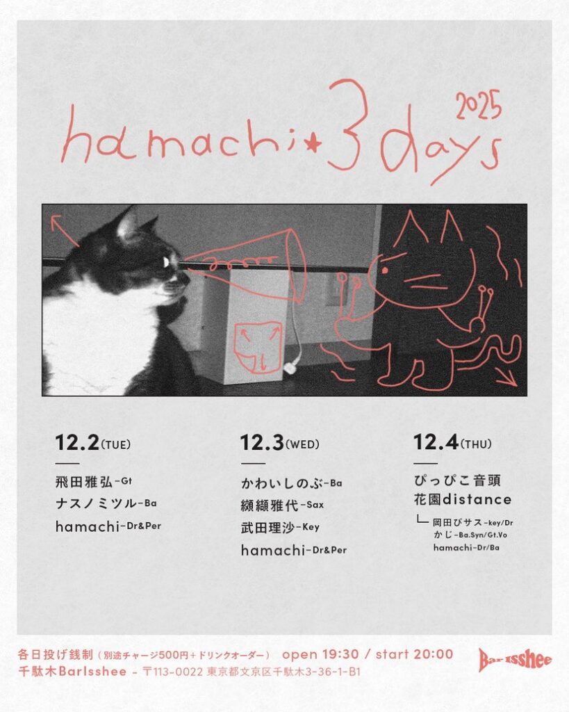 花園distance / LOLOET /ブッセ /HUGEN 等々のDr&Per奏者、hamachiさん3days初日にナスノさんとのトリオで演奏します。是非!