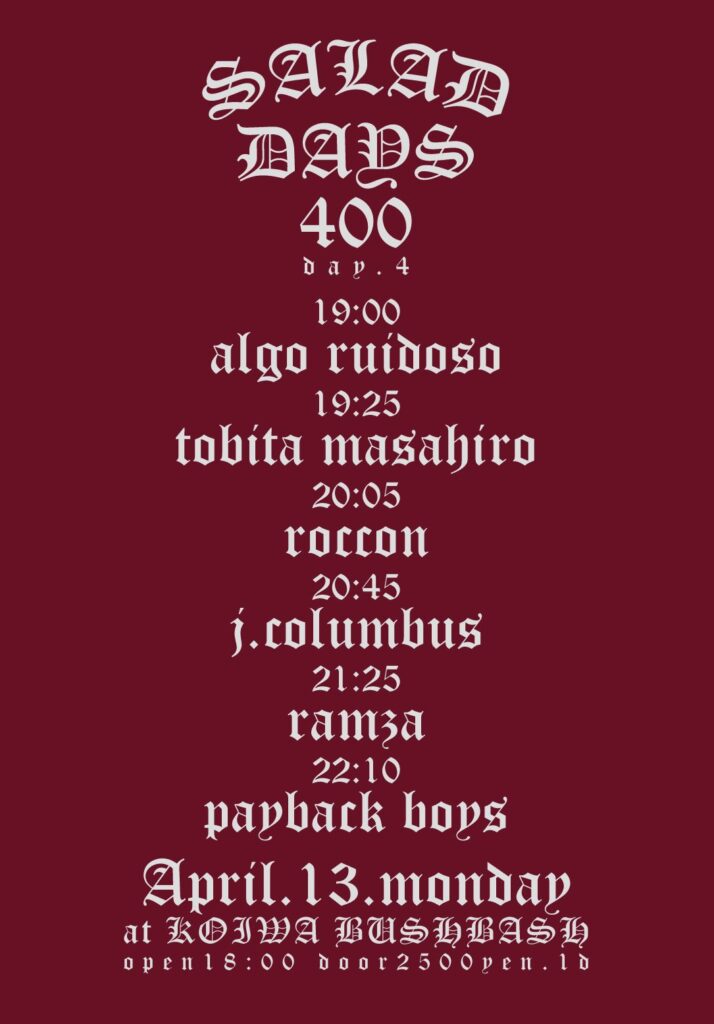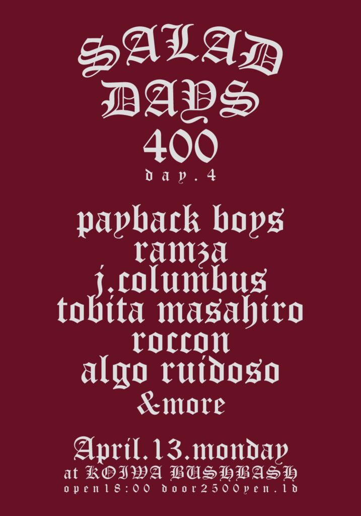 2011年に閉店した小岩eM SEVENで展開していた頃から続く企画、SALAD DAYSの400回を記念した4Daysの四日目、小岩BUSHBASHにて演奏します。